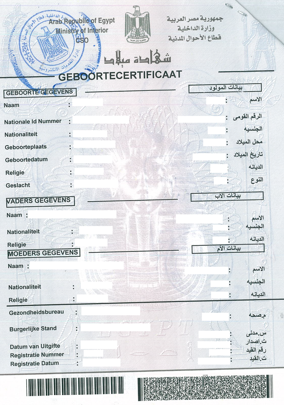 - Bilingual birth certificate (CSO) – Arabic/Dutch