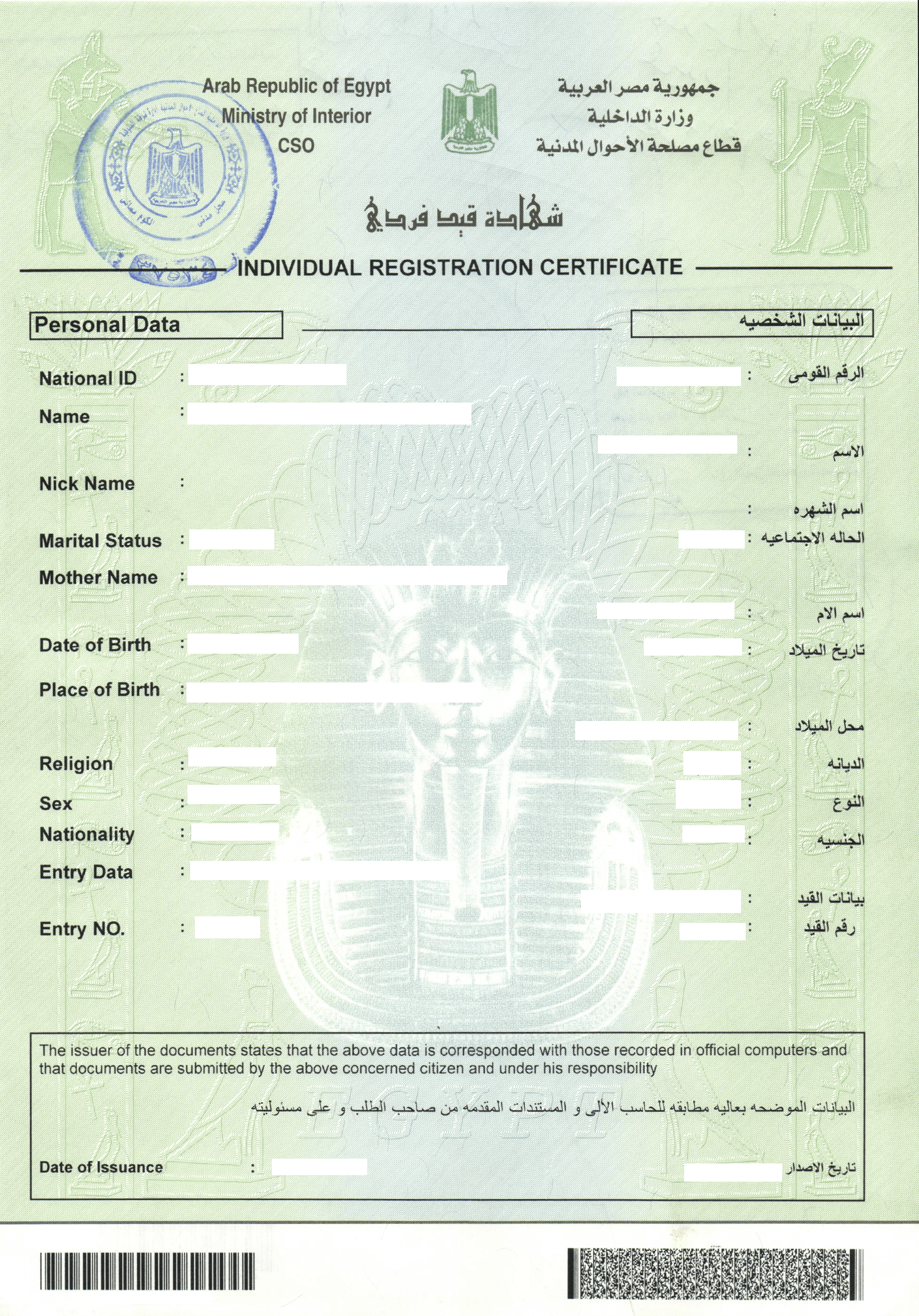 - Bilingual birth certificate (CSO) – Arabic /English